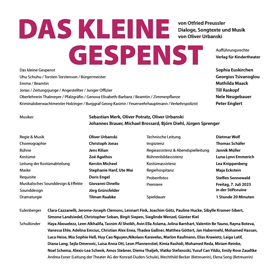 Zum großen Finale versammelt sich das Ensemble noch einmal zu einem gemeinsamen Musikstück auf der Bühne. Die Zuschauer zeigen sich nach der Premiere begeistert und würdigen die Darsteller mit tosendem Applaus. „Das kleine Gespenst“ bietet nicht nur ein tolles Erlebnis für Kinder jeden Alters, sondern auch für Erwachsene, die sich während der Vorstellung vielleicht auch wieder ein Stück in die Kindheit versetzt fühlen.