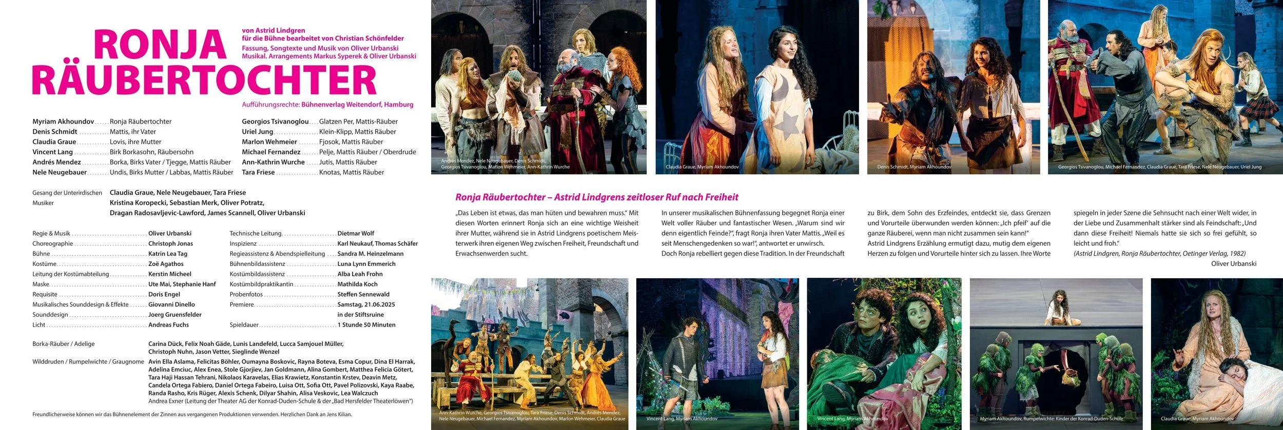 22.06.25 - Mit "Ronja Räubertochter" ist den Bad Hersfelder Festspielen ein mitreißender Wurf gelungen – voller Musik, Witz und Wildnis. Am Samstagabend feierte das Familienstück seine Premiere, die kleine wie große Zuschauer verzauberte. Regisseur und Komponist Oliver Urbanski lässt Astrid Lindgrens Klassiker leuchten - mit einem fantasievollen Ensemble, kindlicher Spielfreude und einem Hauch Gänsehaut.